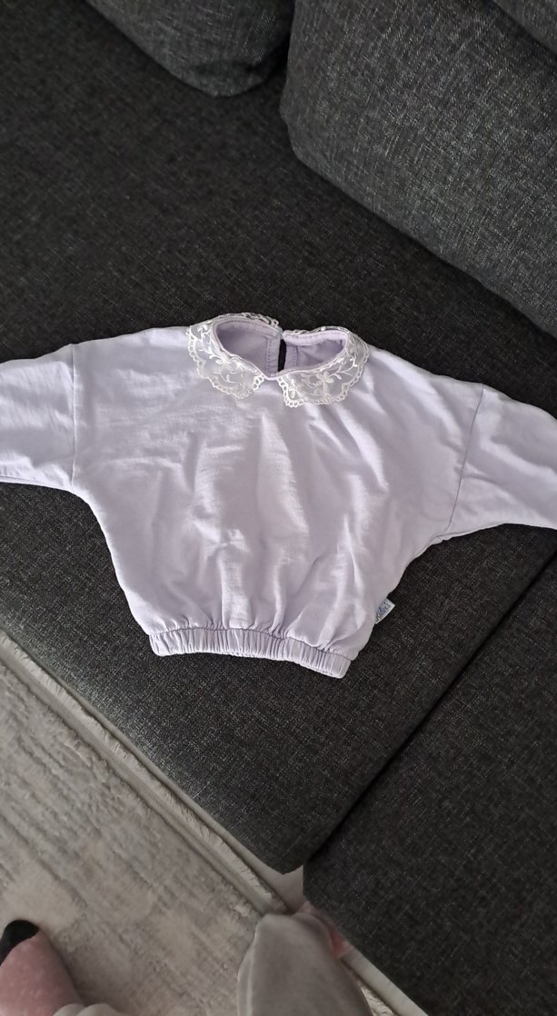 Kız çocuk sweatshirt, uzun kollu, dantel detaylı yuvarlak yaka ve bol kesimdir. Yumuşak pamuktan üretilmiş, sade ve desensiz lila renktedir.