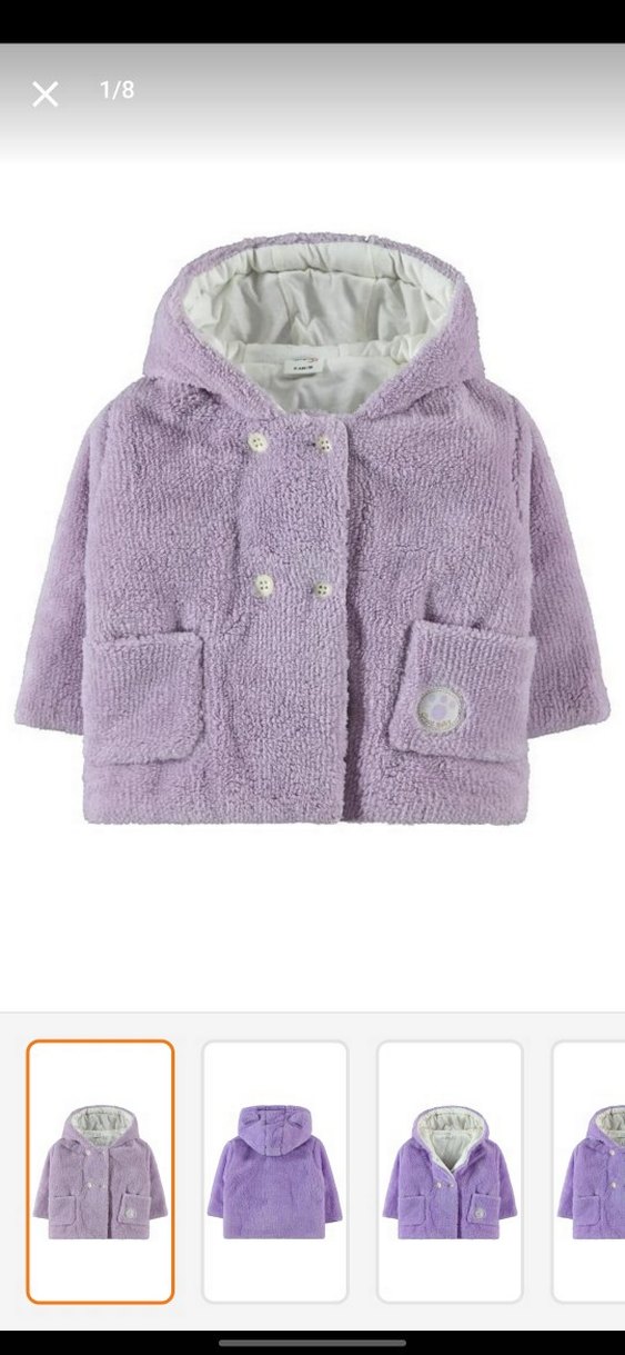 Düğmeli, kapüşonlu ve cepli, lila renkli, bol kesim kız çocuk polar ceketi. Rahat ve temel bir tarz için uygundur.