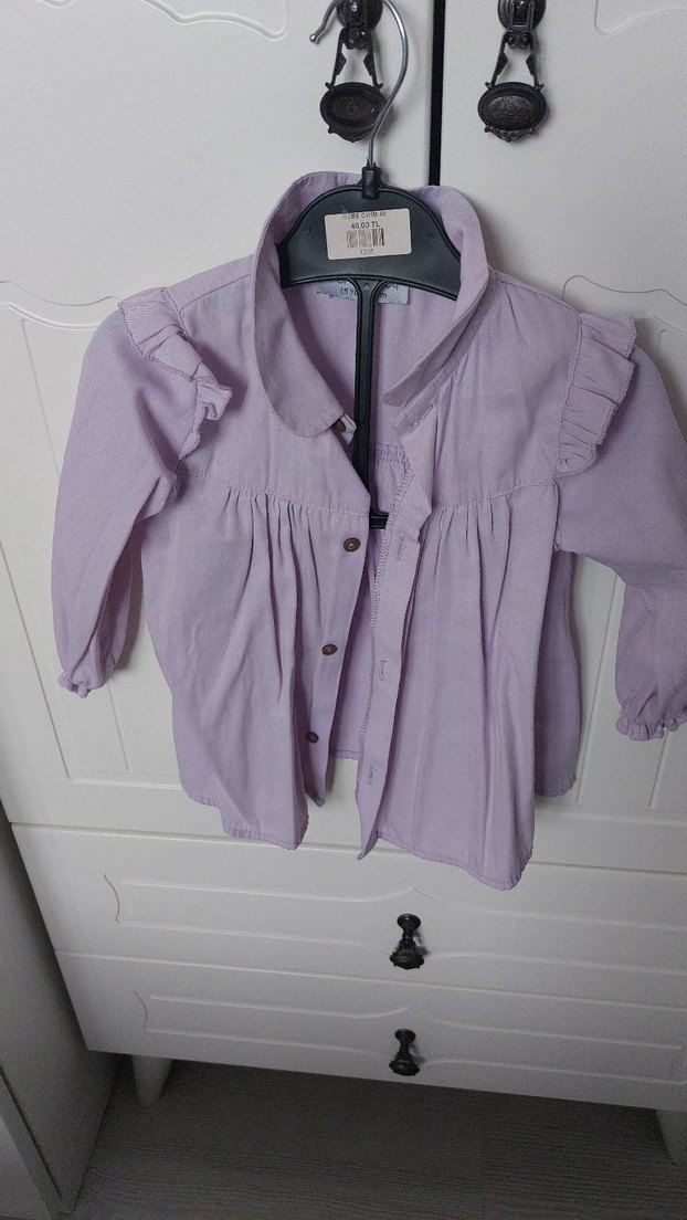 Lila renkli, düğmeli ve yakalı kız çocuk gömleği, yumuşak keten kumaştan üretilmiştir. Bol kesim, uzun kollu ve omuzlarda fırfır detayları bulunur.