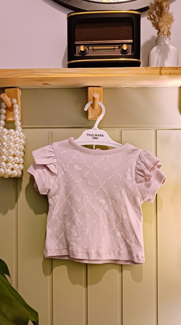 Pastel lila renkte, kısa fırfırlı kollu ve yuvarlak yaka kız çocuk tişörtü. Yumuşak pamuk kumaştan,baskılı desene sahip. PAULMARK markalı.