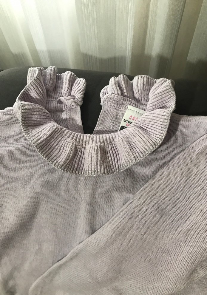 Kız çocuk için lila renkte, triko kumaştan üretilmiş, fırfırlı balıkçı yaka ve uzun kollu, bol kesim bir kazak.