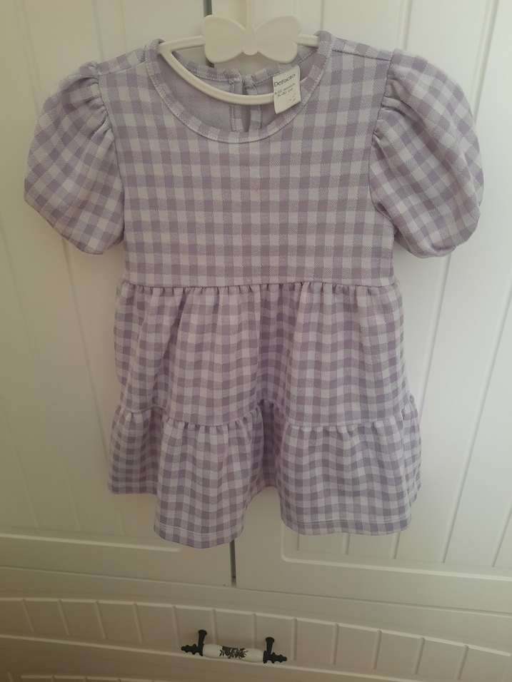 Kız çocuk elbise, kısa balon kollu, yuvarlak yakalı ve bol kesimdir. Lila pastel kareli desende, fırfır detaylı ve yumuşak sentetik kumaştandır.