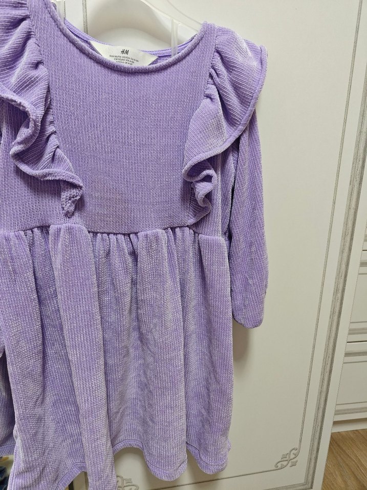 Keten kumaştan yapılmış, bol kesim, uzun kollu ve yuvarlak yakalı kız çocuk lila elbise. Fırfır detayları ve hafif batik deseni bulunur.