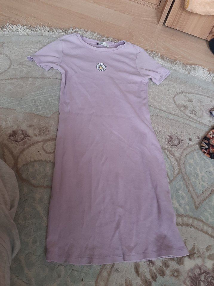 Kısa kollu, bisiklet yaka bu lilac tonlarında kız çocuk elbisesi, yumuşak sentetik kumaştan yapılmıştır.