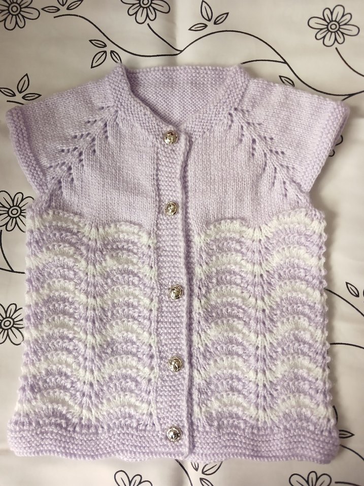 Yeni örüldü taptaze yelek Kolsuz, lila renkli kız çocuk hırkası, bohem tarzında, örgü dokulu ve dalgalı desenlere sahip, önü düğmeli.