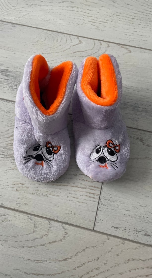 Kız çocukları için lila renkte, içi turuncu kürk detaylı, nakışlı eğlenceli yüz desenli sıcak panduf hiç kullanılmadı