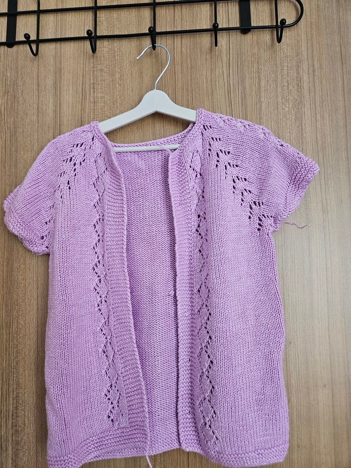 Kız çocuklar için lila renkte, bohem tarzda, kısa kollu ve bol kesim örgü hırka. Dantel detaylı sade tasarım.