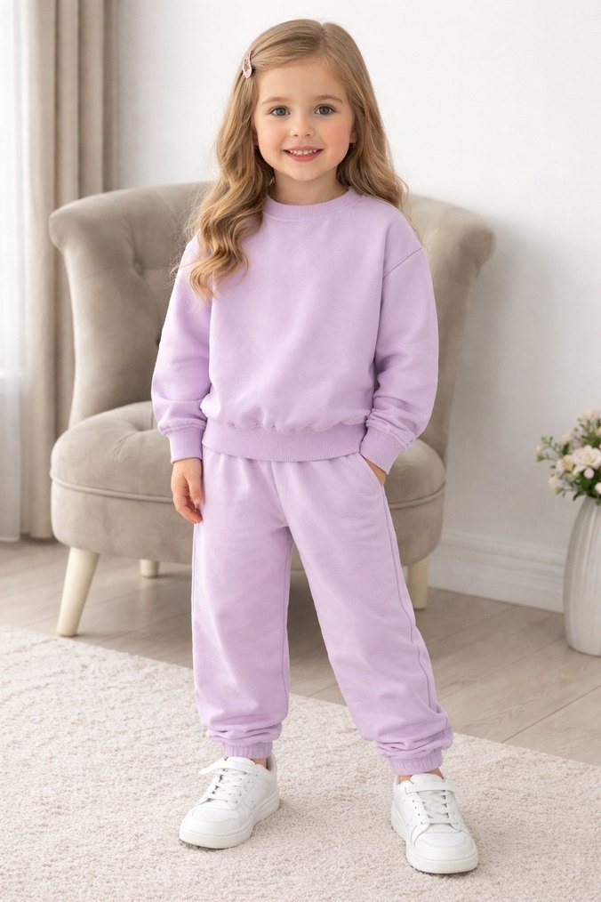 Kız çocukları için lila renginde, bol kesim, uzun kollu ve yuvarlak yakalı, yumuşak ve sıcak kumaştan üretilmiş sade ve rahat bir eşofman takımı. 2/6 yaş arası