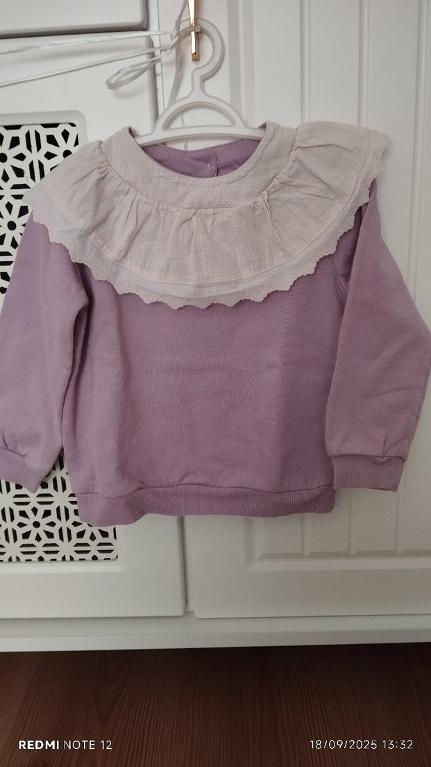 Kız çocuk lila sweatshirt, bol kesim, uzun kollu ve yuvarlak yakalıdır. Yumuşak pamuk kumaştan üretilmiş, yakasında nakışlı fırfır detayı vardır.