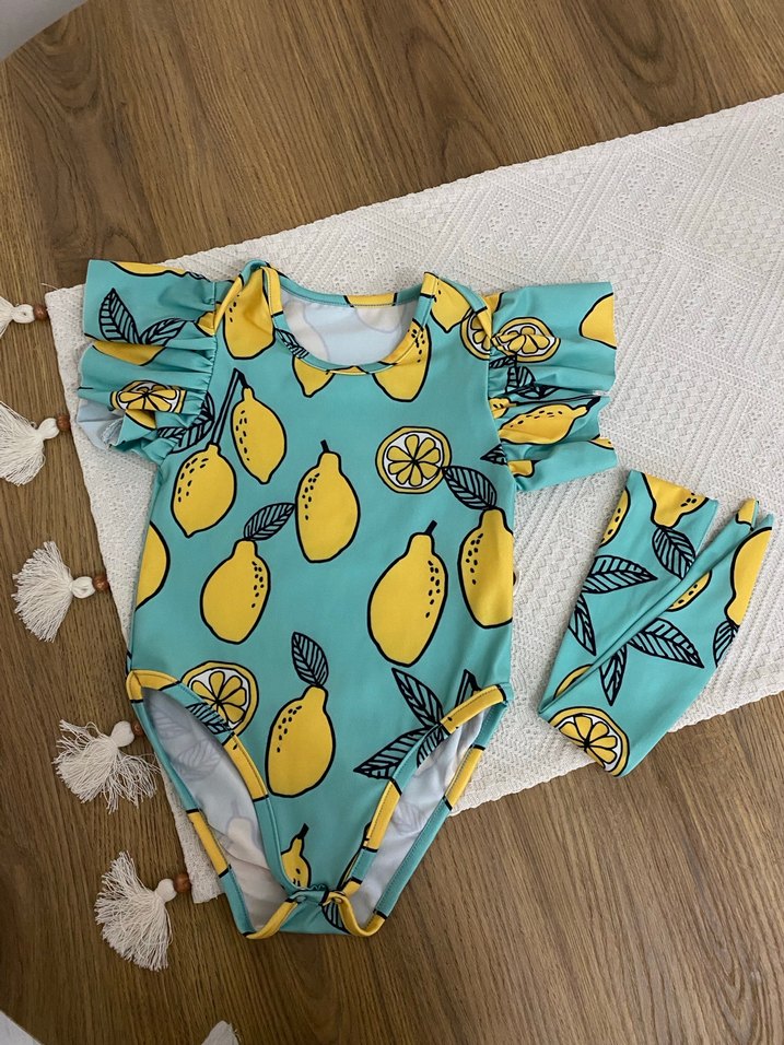Kısa kollu, renkli limon desenli kız çocuk mayosu, plaj için bohem tarzda tasarlanmıştır. 18-24 ay bandanası ile takımdır