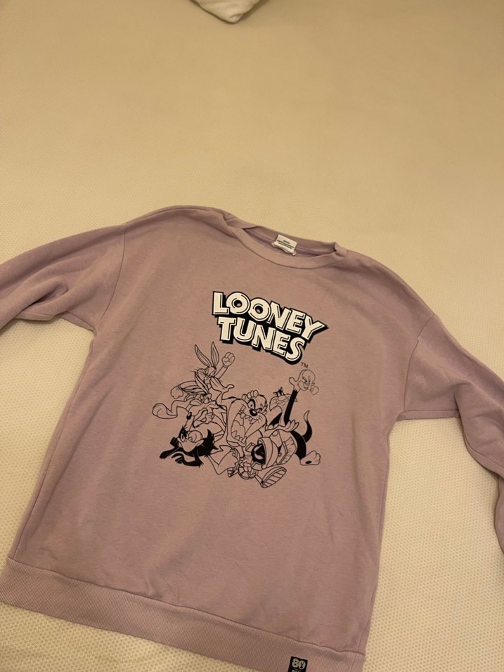 Uzun kollu, yuvarlak yakalı, bol kesim kız çocuk sweatshirtü. Looney Tunes baskısı ve dantel detaylarıyla pastel bej renkli, yumuşak keten kumaştan yapılmıştır.