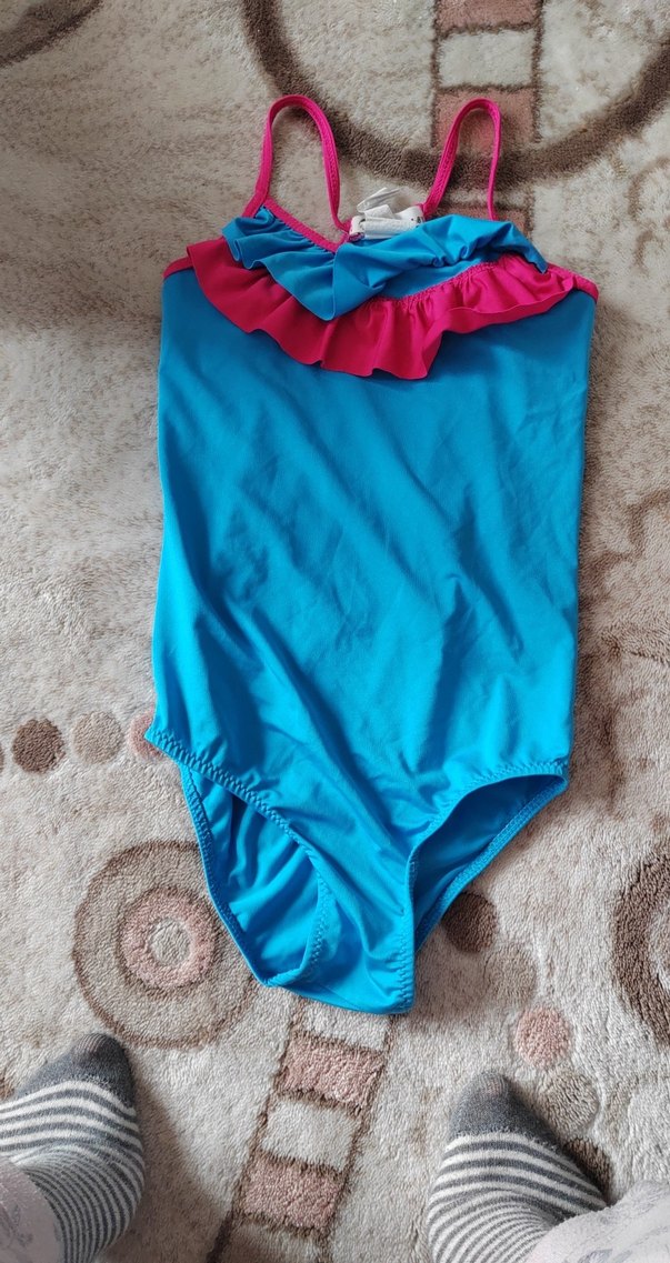 Pastel mavi renkte, askılı ve pembe fırfırlı kız çocuk mayo. Düz ve pop kültür tarzında, plaj için uygun.