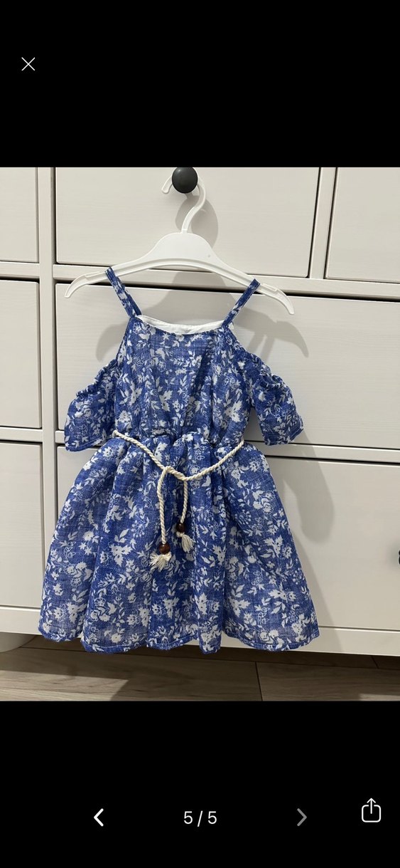 Kız çocuk için pamuklu, bağcıklı ve askılı, straplez yaka bohem tarzda mavi renkli elbise. Rahat kesim ve hafif batik desenli.