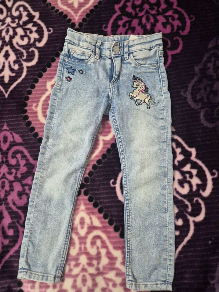 Kız çocukları için fitted kesim mavi denim pantolon, pastel tie-dye görünümü, bağcıklı detay ve unicorn ile yıldız işlemeleri içerir. Trend sokak stili için uygun.