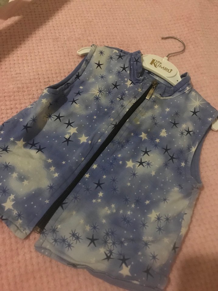 Kız çocuklar için kolsuz, fermuarlı ve yüksek yakalı yelek. Pastel mavi bağlama desenli ve yıldız motifli, bol kesim sokak stili yelek