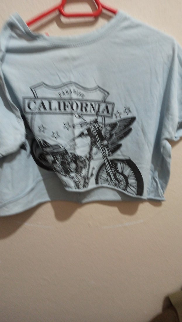 Mavi denim kumaştan, baskılı motosiklet deseni ve bisiklet yaka ile bol kesim kız çocuk biker tişörtü. Kısa kollu ve tokalı detaylı. ️