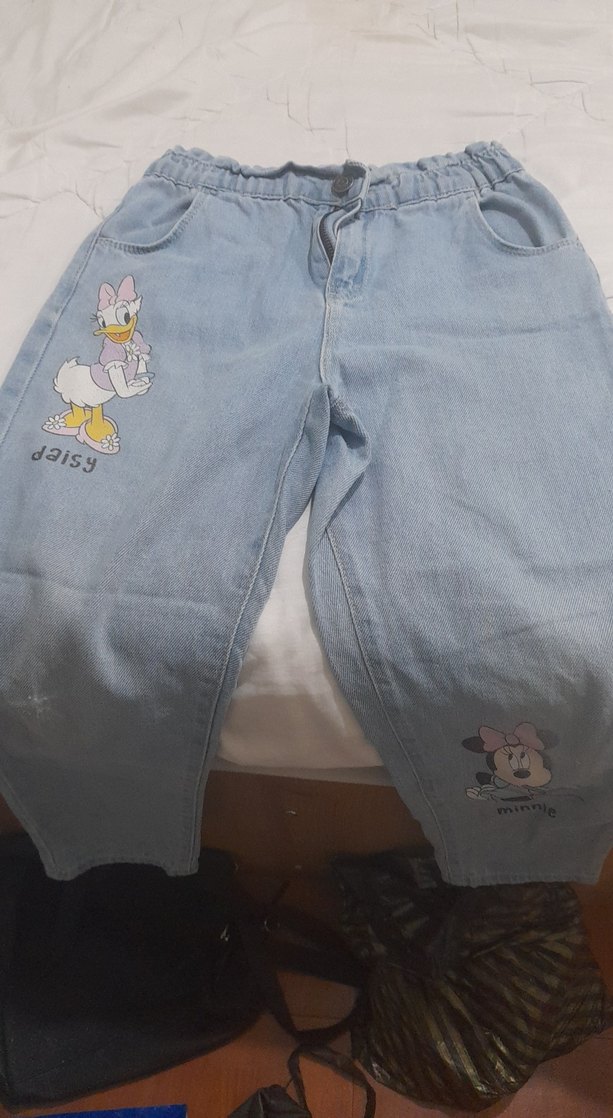 Kız çocuklar için bol kesim, mavi kot pantolon. Üzerinde Daisy ve Minnie baskıları, düğmeli beli ve pastel tonlarıyla sokak stili için uygun. 9-10 yaş