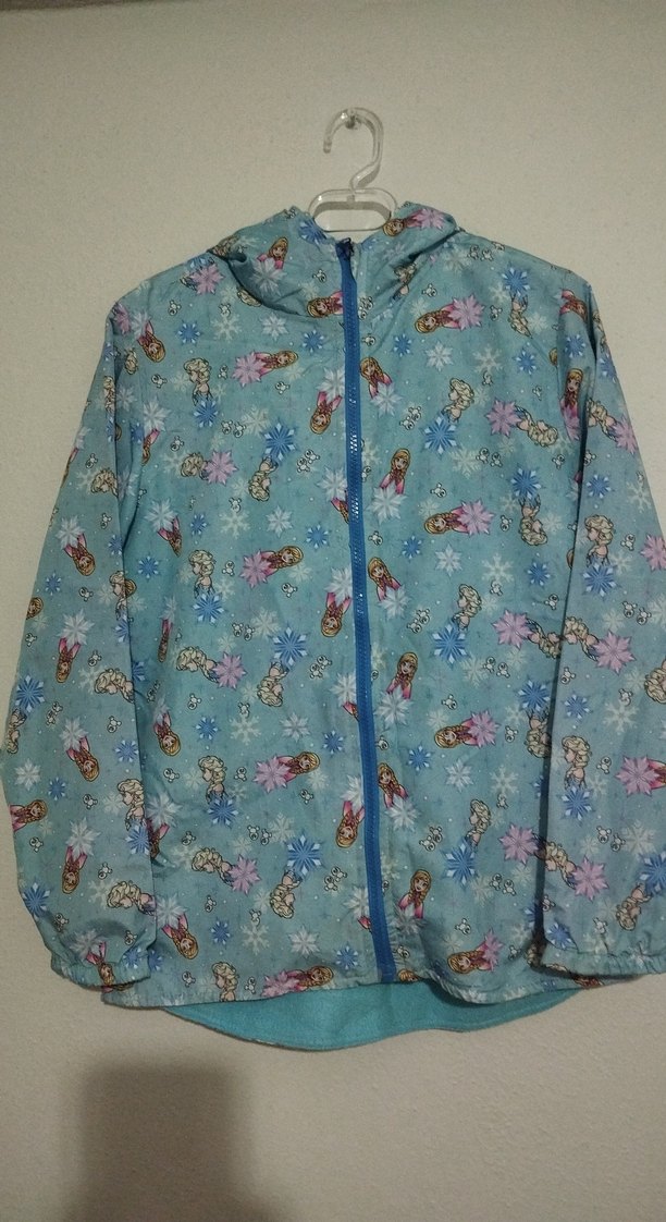Pastel mavi renkte, baskılı desenli, fermuarlı ve yuvarlak yakalı kız çocuk yağmurluğu. Yumuşak ve sıcak kumaştan, bol kesim, bohem ve retro tarzda.