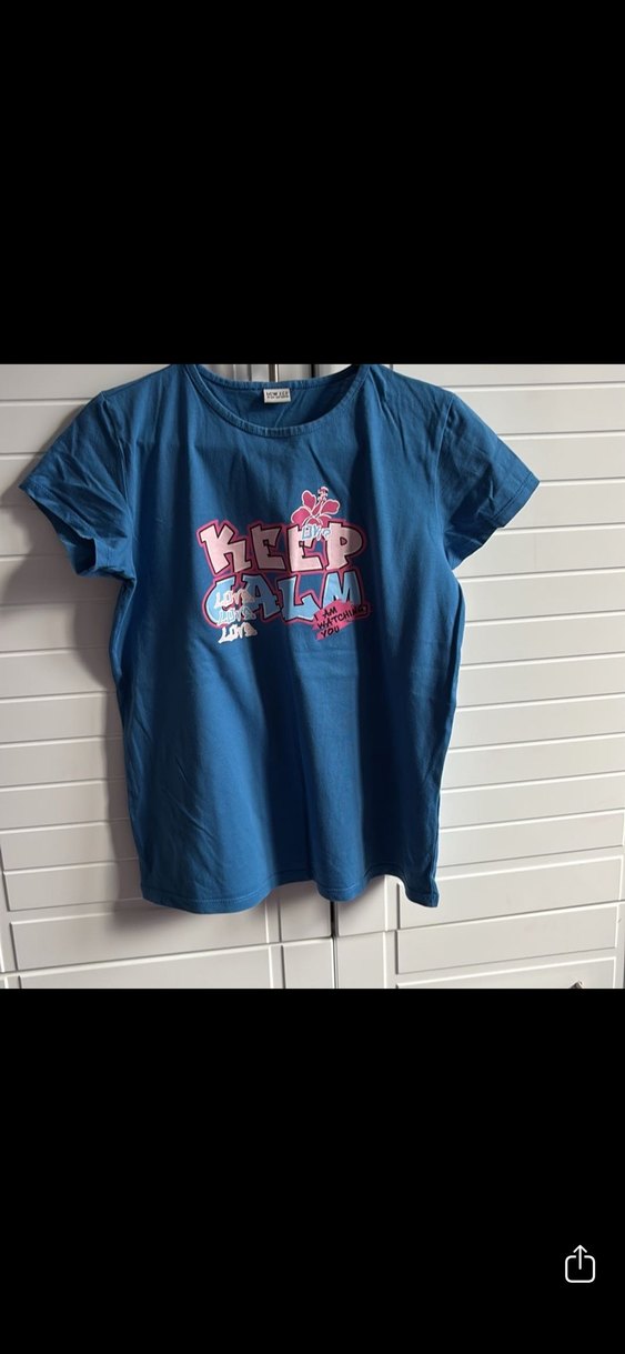 Kız çocuk tişörtü, kısa kollu ve yuvarlak yakalıdır. Koyu mavi denim renginde, bol kesim ve baskılı 'Keep Calm' deseniyle bohem ve retro tarzını yansıtır.minik defosu mevcuttur
