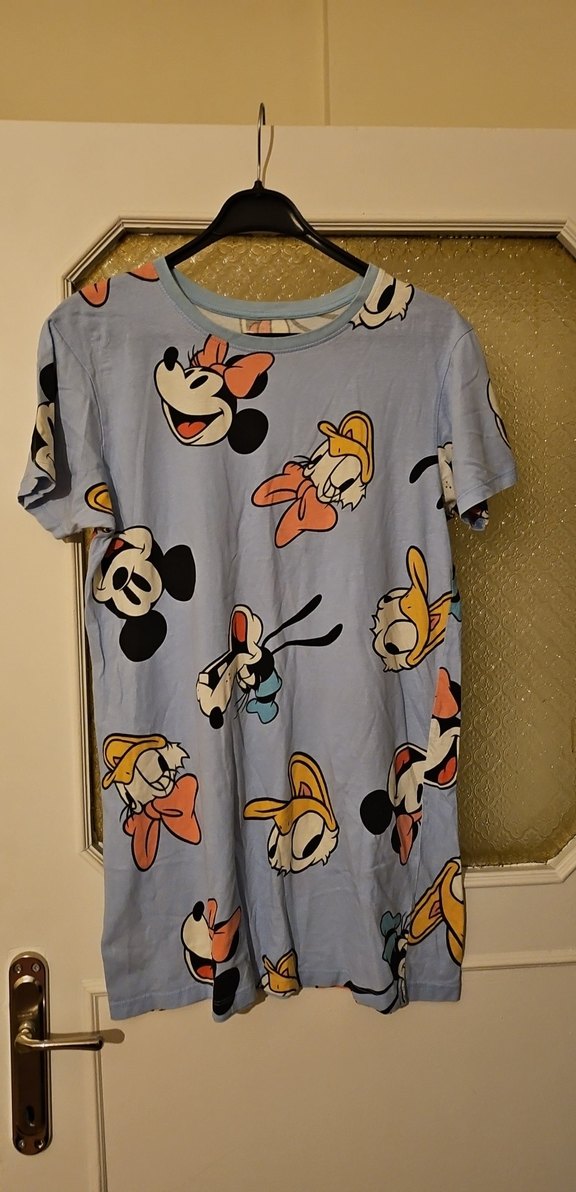 Kız çocukları için pamuklu, mavi, kısa kollu, yuvarlak yakalı, bol kesim tişört. Baskılı desenler ve düğme detayları ile rahat ve şık.