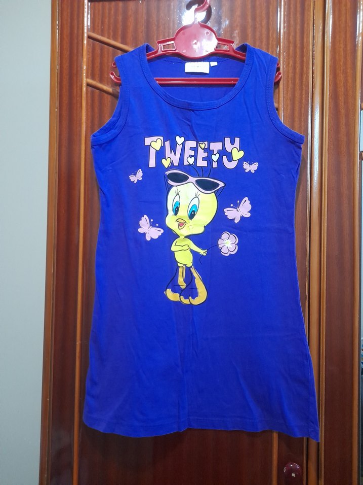 Kız çocuklar için mavi, kolsuz, dar kesim tişört. Renkli Tweety baskısı ve kabartmalı detaylara sahip, yuvarlak yakalı.