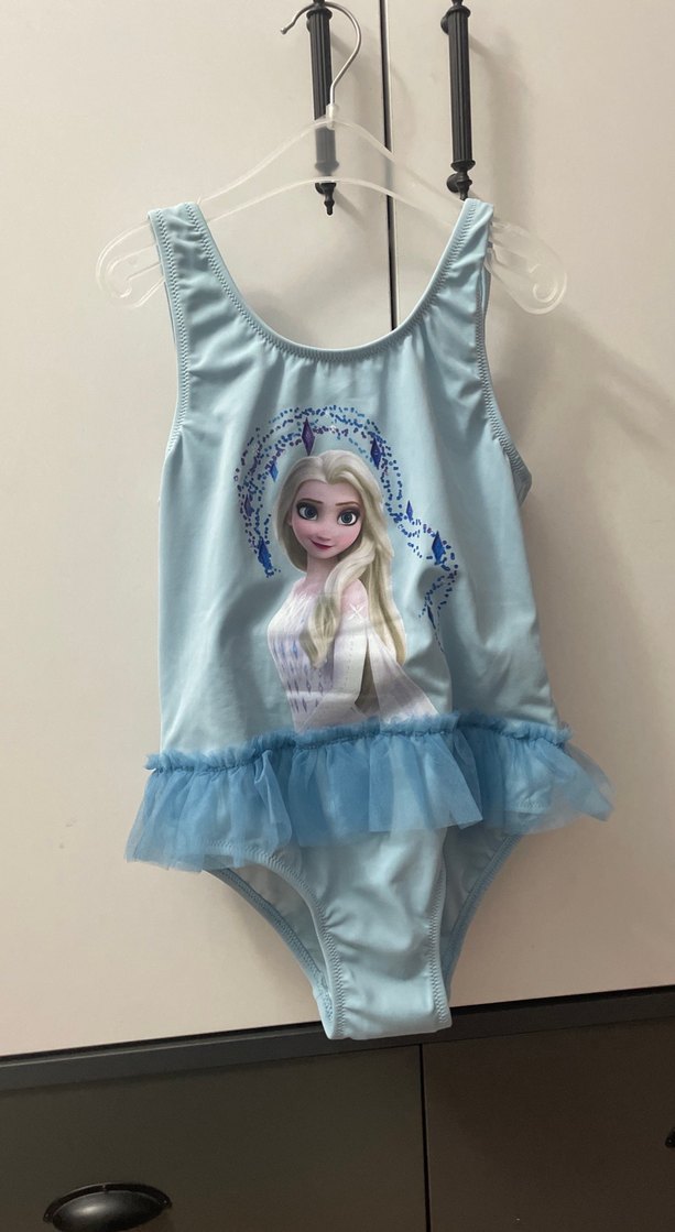 Kolsuz, pastel mavi renkte, baskılı karakter figürlü ve etek kısmında tül detaylı kız çocuk mayosu.