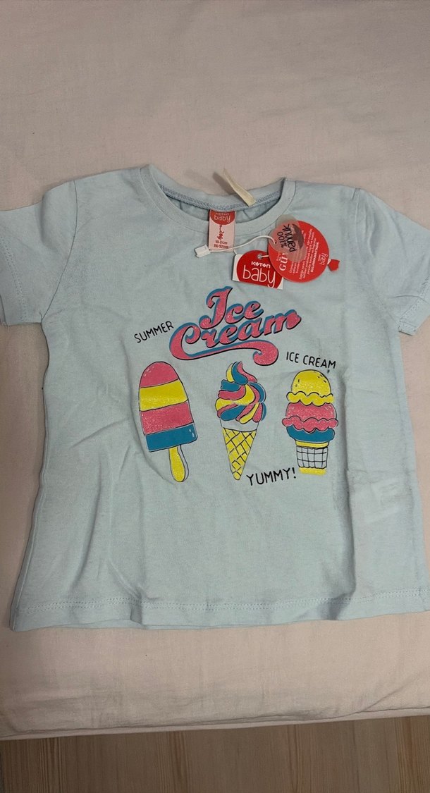 Mavi renkli, kısa kollu, yuvarlak yakalı kız çocuk tişörtü. Pamuklu, örme dokulu kumaş ve renkli dondurma baskılarıyla yaz temalıdır. #koton #mavi #çocuk
