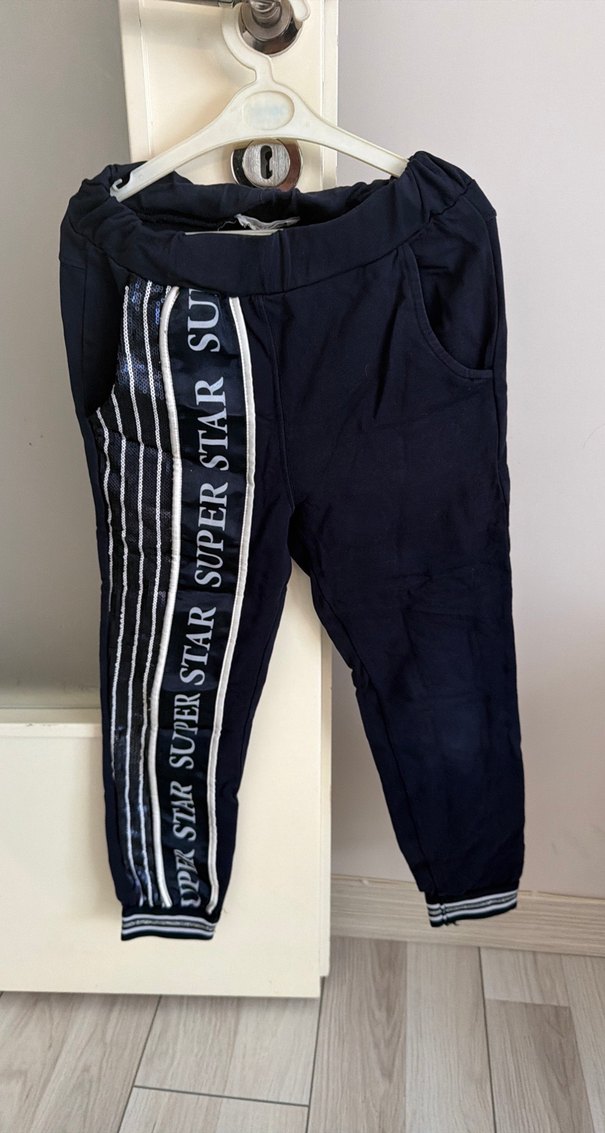 Kız çocuklar için koyu mavi baskılı "SUPER STAR" şeritli, lastikli beli ve yan cepleri olan rahat kesim eşofman.