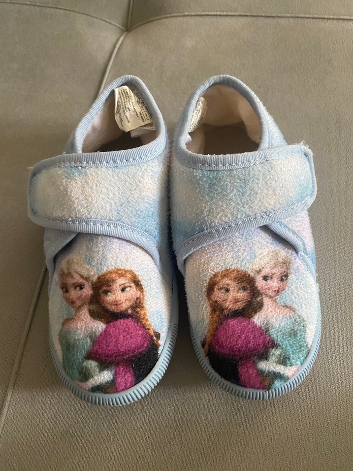 Kız çocuklar için örme, mavi baskılı, pastel tonlarda yumuşak ve sıcak kumaşlı ev terliği. Tertemiz cırt cırtlar sıkı tutmuyor ama