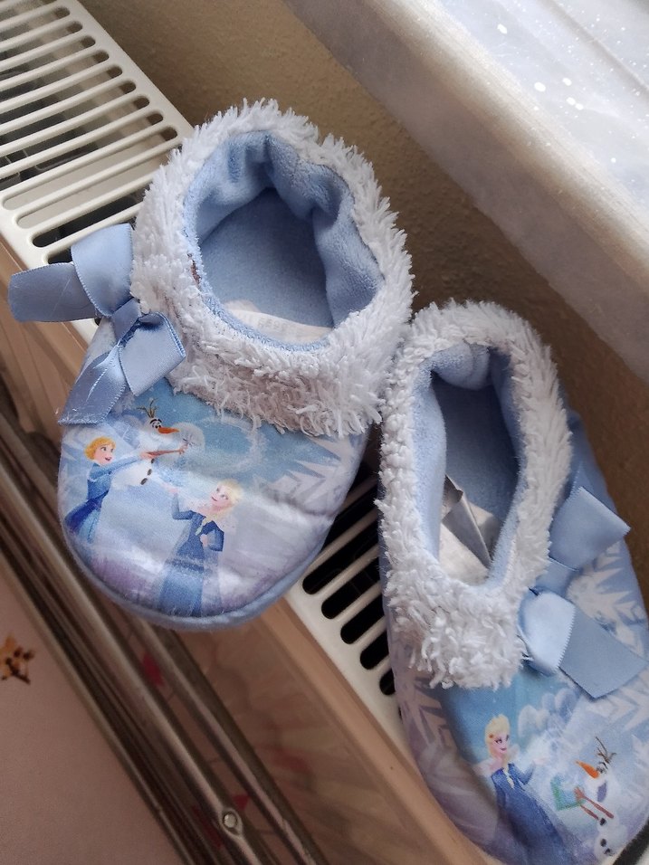 Kız çocukları için pastel mavi baskılı, kenarları kürklü sıcak terlikler. Yumuşak ve sıcak polar kumaştan yapılmıştır.