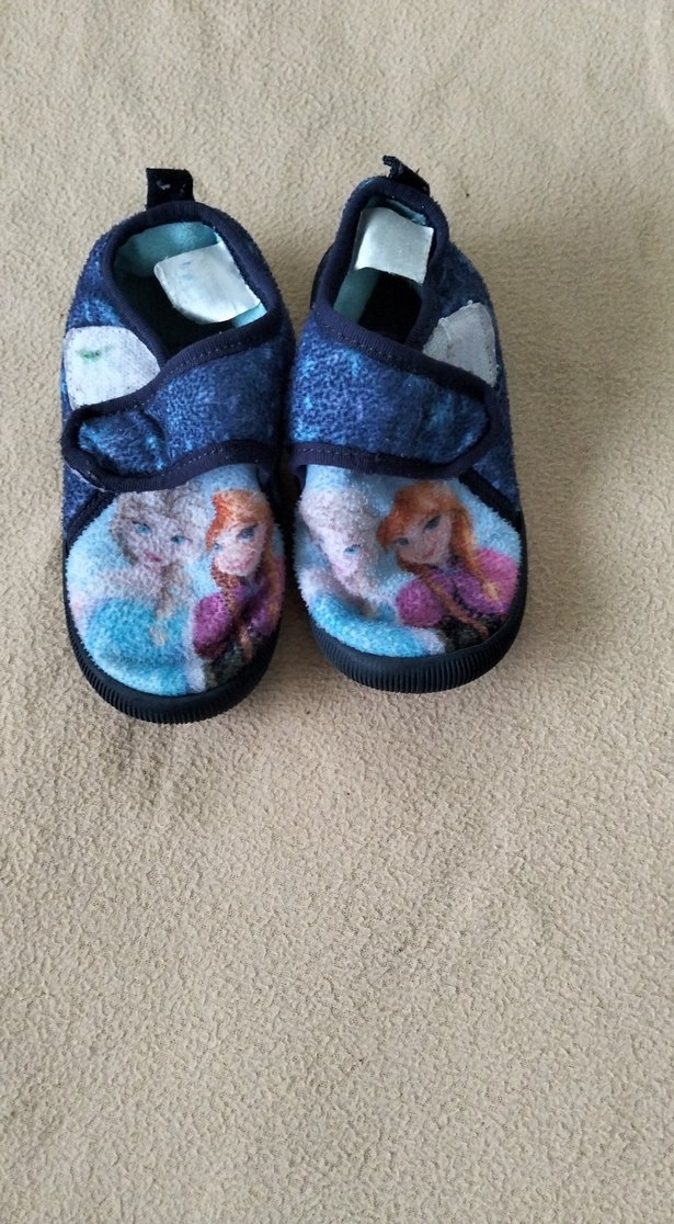 Koyu mavi baskılı kız çocuk terlikleri, yumuşak ve sıcak kumaş ile velcro bantlara sahiptir. Rahat sokak stili için uygundur.