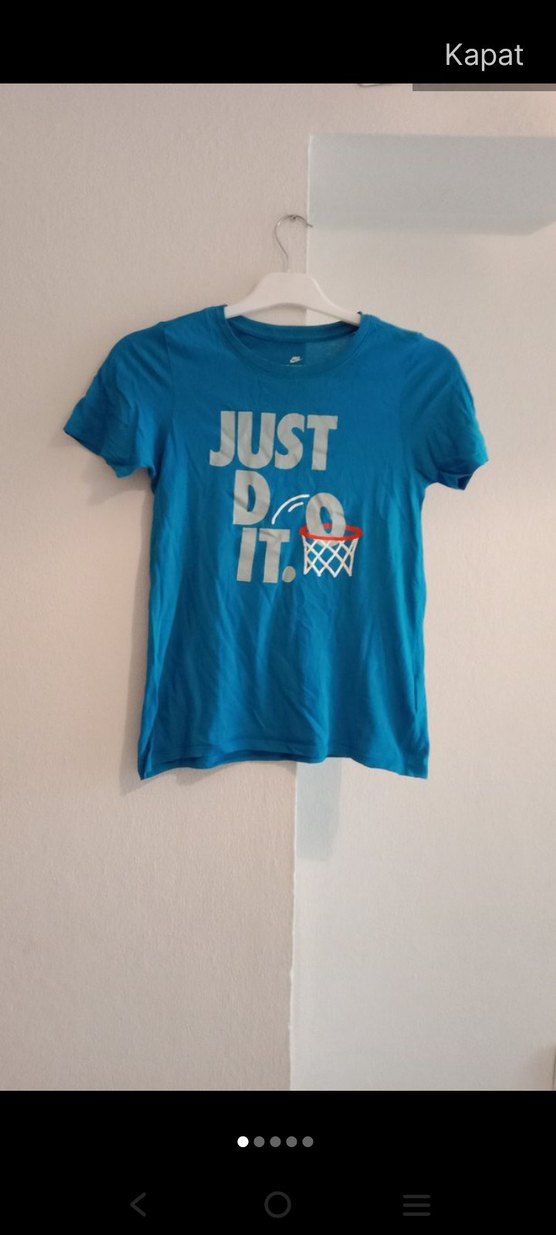 Mavi pamuk kısa kollu tişört, renkli baskılı basketbol deseni ve 'JUST' yazısı ile, yuvarlak yaka ve bol kesim, rahat sokak stili için uygundur.
