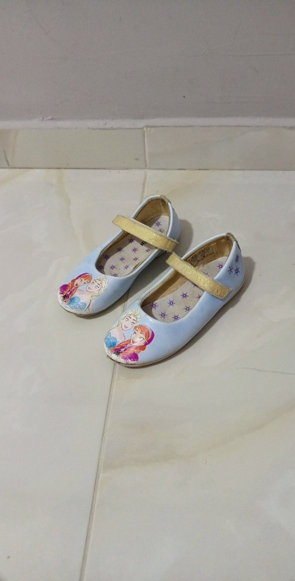 Kız çocukları için mavi baskılı ve tokalı, rahat kauçuk babetler. Pastel renkleriyle şık ve kullanışlıdır.