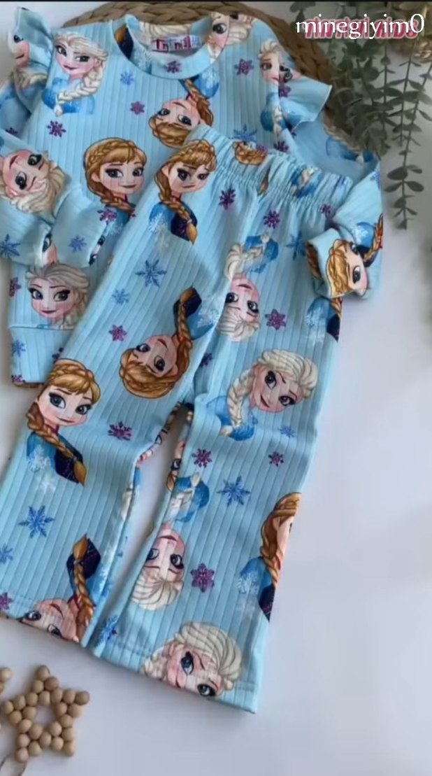 Pastel mavi kız çocuk pijaması, uzun kollu ve tekne yaka. Yumuşak ve sıcak fleece kumaştan, baskılı ve pileli tasarım. ❄️