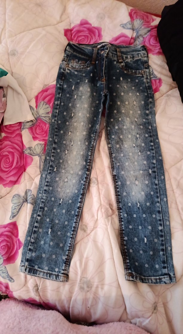 Kız çocuklar için renkli batik desenli, düğmeli, mavi regular fit denim pantolon. Sokak modasına uygun rahat stil.