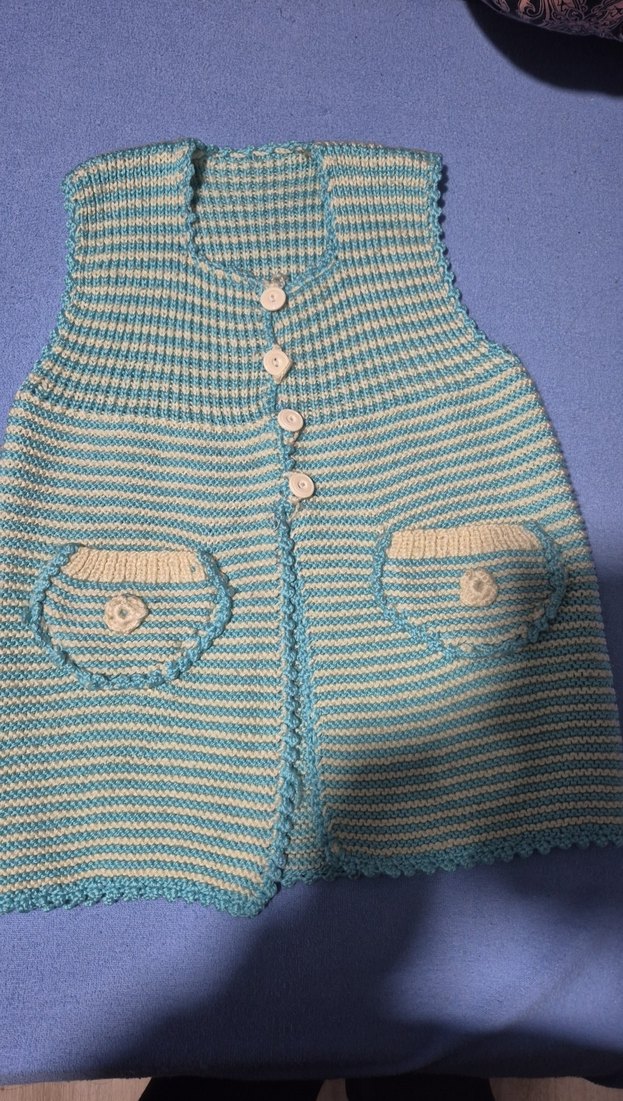 Kız Çocuk Mavi beyaz el örgüsü yelek..cepli