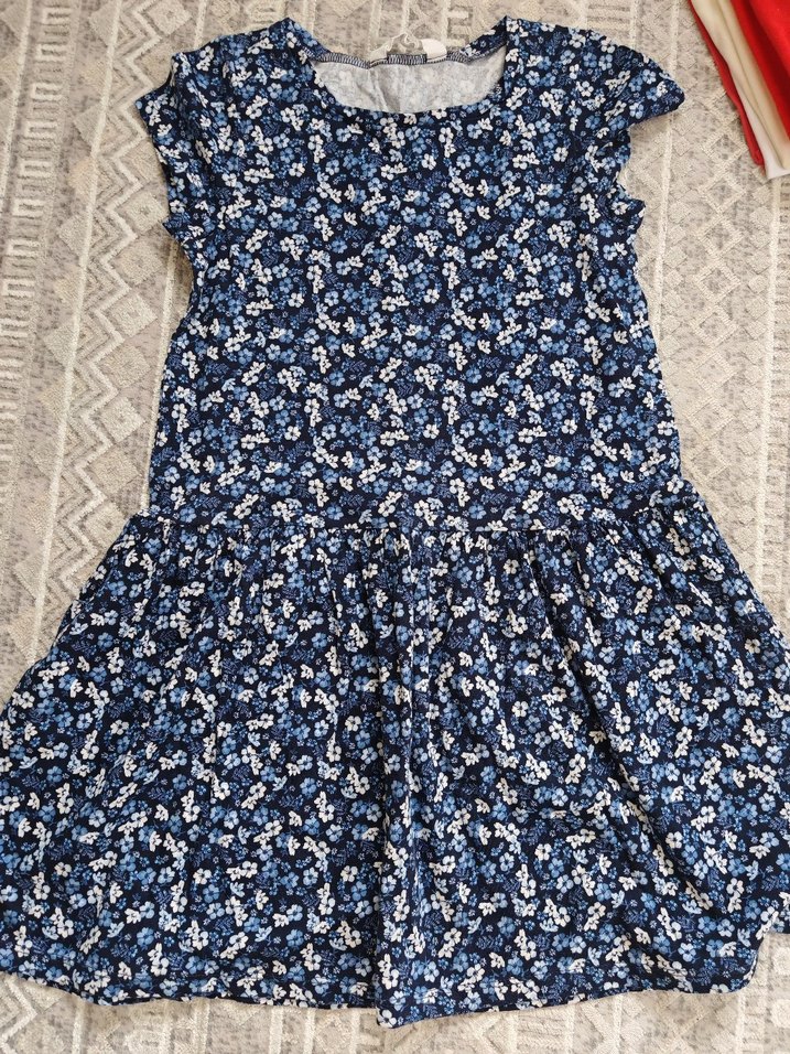 Kız çocuklar için kısa kollu, yuvarlak yakalı, yumuşak sentetik kumaştan yapılmış, mavi çiçek desenli ve fırfırlı, bol kesim bir elbisedir.