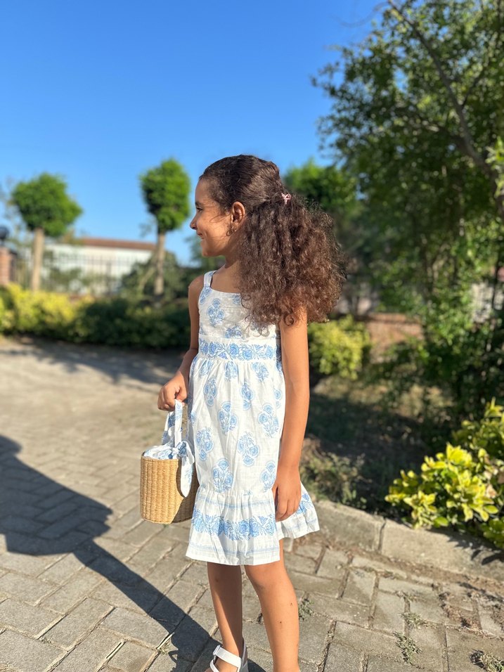 Mavi pamuklu, bağcıklı askılı, dantel detaylı ve pastel batik desenli bol kesim kız çocuk elbisesi. Bohem tarz için uygun.ithal üründür çantası dahil