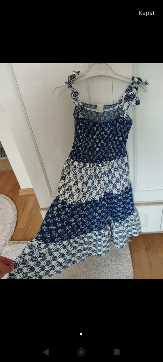 Kız çocuk elbise, askılı ve fırfırlı detaylara sahip. Mavi ve gri tie-dye deseniyle bohem ve retro tarzı yansıtıyor. Rahat ve şık bir tekstil kumaşından yapılmıştır.
