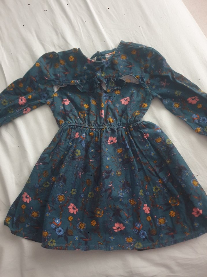 Mavi renkli, bohem tarzda kız çocuk elbisesi. Bol kesim, uzun kollu ve yakalı, çiçek desenli ve fırfırlı detaylara sahiptir.