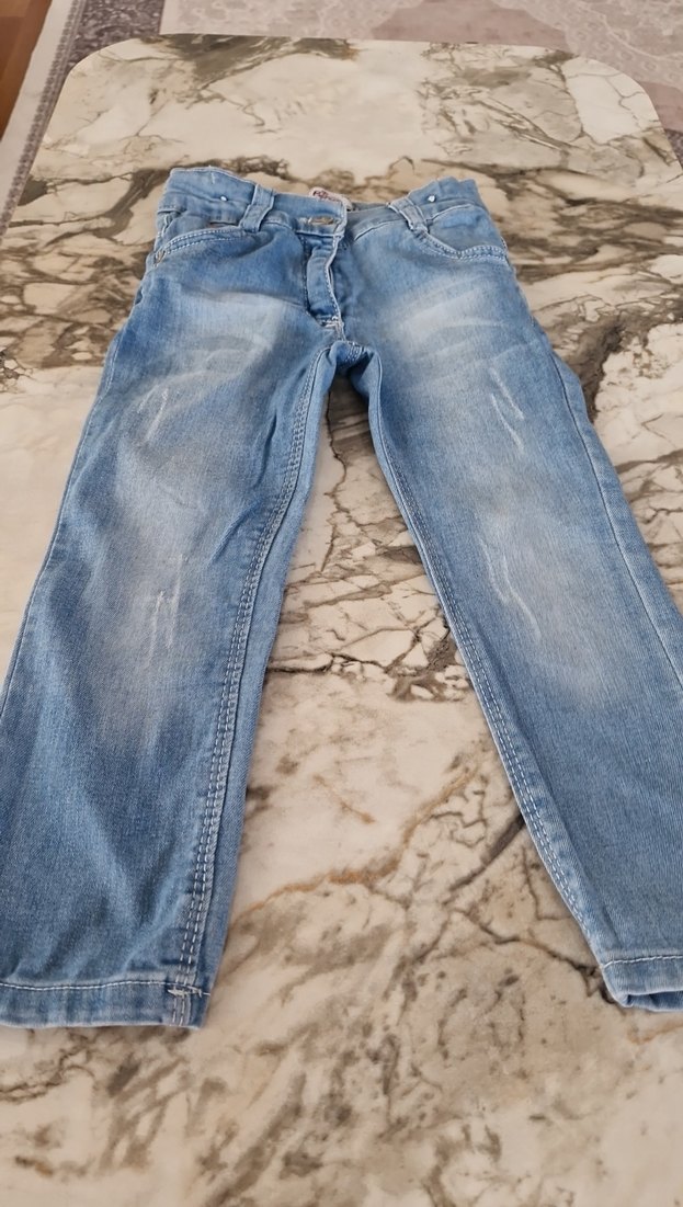 Mavi renkli, bol kesim kız çocuk denim pantolon. Tokalı bel detayı ve hafif gri solukluklarla rahat ve günlük stil sunar.