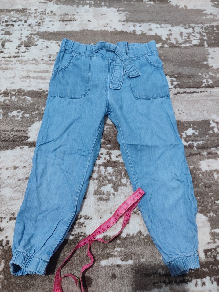 Pastel mavi renkte, bol kesim ve kemerli kot pantolon. Elastik bilek detayıyla rahat ve şık sokak tarzı için uygundur. iç bacak ölçümü 34 cm