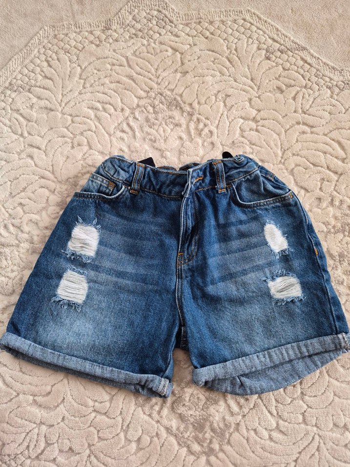 Kız çocukları için bol kesim mavi kot şort, kemer tokalı ve yıpranmış detaylara sahip, sokak tarzına uygun.
