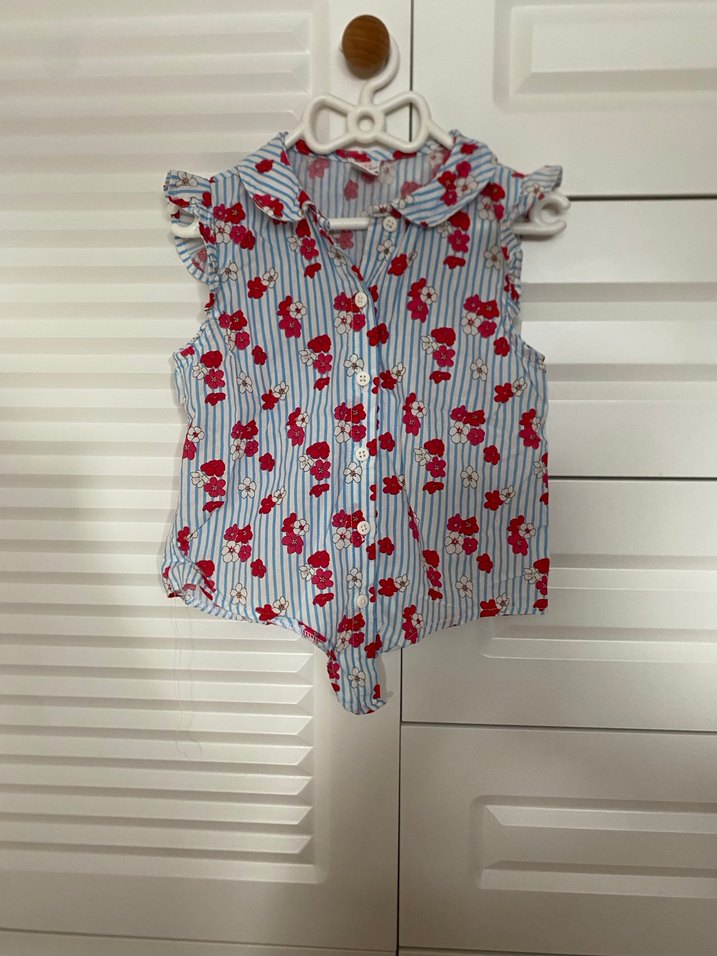 Kız çocuklar için pamuklu, kolsuz ve düğmeli bu gömlek, yakalı ve fitted kesimdir. Pastel mavi zemin üzerinde kırmızı çiçek desenleriyle bohem tarzı yansıtır.