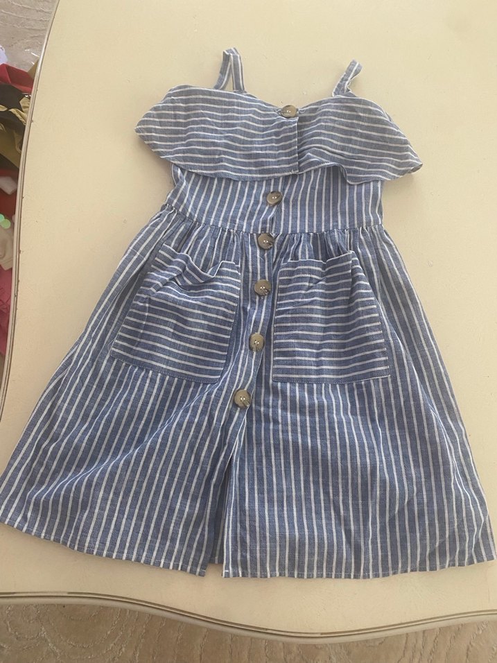 Düğmeli, askılı ve straplez yakalı, bol kesim kız çocuk keten elbise