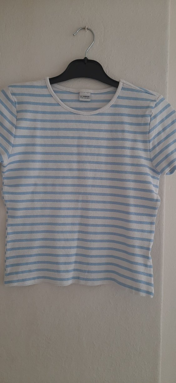 Pamuk kumaştan yapılmış, kısa kollu, mavi çizgili,kız çocuk tişörtü. ölçüleri paylaştim lütfen ona bakıp alınız. iade almıyorum. kalıp farklı olabiliyor daha çok 10 12 yaş gibi sanki