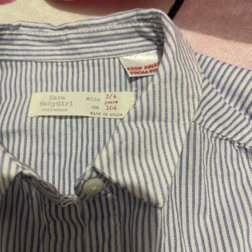 Zara kız çocuk gömlek, düğmeli, kısa kollu ve V yakalıdır. Pamuktan yapılmış, mavi ve gri çizgili desene sahip, regular fit modeldir. 3/4 yaş, 104 cm.