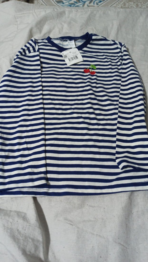 Kız çocuk tişörtü, uzun kollu ve yuvarlak yaka, yumuşak pamuk kumaştan. Mavi-beyaz çizgili, bol kesim ve kiraz detaylı çorapla birlikte
