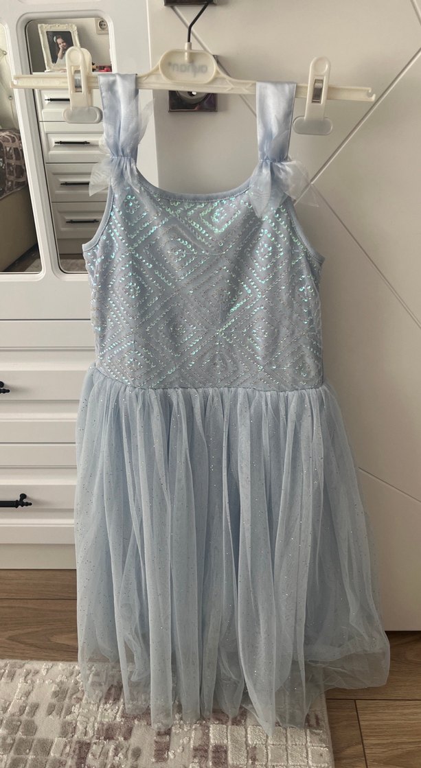 Mavi renkli, dantel detaylı, straplez kesim ve bağcıklı askılı kız çocuk elbisesi. Yumuşak sentetik kumaştan, bohem ve retro tarzda.. 9-10 yaş uyumlu yalnızca 1 kez 23 Nisan gösterisinde kullanılmıştır. Deformesi asla yoktur.