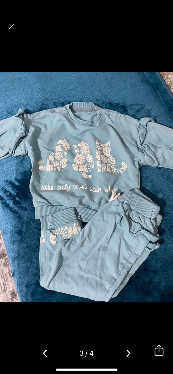 Hiç giyilmedi sadece yıkandı. Pastel mavi renkli, bol kesim kız çocuk sweatshirt ve eşofman takımı. Uzun kollu, yuvarlak yaka, yumuşak kumaş ve dantel desenli baskılarla sokak stiline uygun.